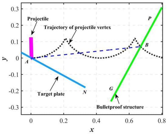 Normally, the size of the target and the impacting point are predefined, but the location of the bulletproof structure is unknown, although it plays a key role in the protection of key targets from damages caused by projectile ricocheting. The aforementioned analytical method may contribute to finalizing the exact location of the bulletproof wall when the ricochet range is certain. A linear bulletproof wall is simply considered in Figure 4, where is the impacting point of the projectile ricocheting. The equation of can be expressed as: