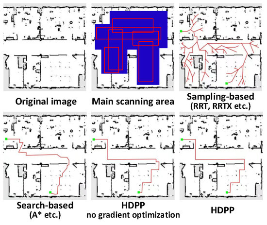 Illustration of an example. Boxes with red lines and blue block are main scan area. We show path planning result by HDPP (ours), sampling-based methods and search-based methods. Noticeably, the proposed HDPP has generated the least waypoints, also the most efficient in high-dimensional space. In addition, we show comparison before and after optimization in order to clearly see the effect of HDPP’s gradient optimization operation.