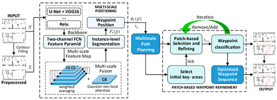 Next, we input the filled result into the 2-channel feature extraction pyramid network and, respectively, obtain 5 different-sized corner feature maps {C1, C2, C3, C4, C5} for obstacles and path information. The features contain various categories of waypoints, such as road boundary, road center, close to obstacle etc. Then, we segment the two-channel multi-scale feature maps separately to obtain different a priori boxes and position predictions for each contour. These feature maps contain both strongly represented semantic information and geometric details. We will accomplish multi-scale feature fusion in a serial multi-branch structured feature pyramid, mainly through layer-hopping connections. We return the feature rescaling obtained at low scale (for example, {C1, C2, C3}) to the high scale feature layer (for example, C4) by weighted averaging to improve the feature resolution. In addition, Gaussian non-local attention is used to increase the features. Residual connectivity will also be used in the information integration calculation for multi-scale fusion. This process is described in detail in the pseudo-code of Algorithm 1. In order to improve the model representation ability, we obtained multiple results through multiple rounds of cross fusion to prevent performance degradation caused by interference.