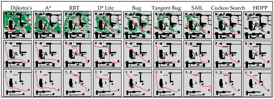 Selected Path Planning Results for Qualitative Experiment. The figures are the planning results of different algorithms on six-degree-of-freedom robotic arm. The three rows are the original scanned map, the normalized map and the simplified map. The black pixels in the figure represent obstacles. The start node (represented by “S”) and the target node (represented by “G”) have been marked in the first column of the first row. The optimal path planned by the algorithm is represented by red nodes, and other explored nodes are displayed in green.