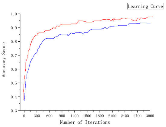 Learning Curve. The horizontal axis of the figure in the figure represents the number of iterations. The vertical axis represents the training accuracy. The blue line is the training curve without patch optimization and gradient balance, and the red line is the training result after the module is introduced. It can be clearly seen that the addition of modules makes the model learn faster and better, and the optimization node ushered in at an earlier time.