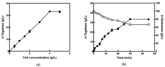The production of d-tagatose from d-galactose was further optimized by varying the concentration of the recombinant cells (Figure 5a). The production increased with an increase in the concentration of cells up to 4 g/L and reached a plateau above that concentration, indicating that the optimum concentration for the recombinant E. coli cells was 4 g/L.