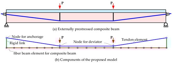 Based on the principles of high computational efficiency and accuracy, the schemes of the proposed model are built, as shown in Figure 1. There are two new types of elements introduced. For the steel-concrete composite beam, a new type of fiber beam element considering nonlinear interfacial connection is proposed, improving the drawbacks of traditional fiber beam element without interface-slip effects. For the external tendons, a multi-node slipping cable element is proposed to model the slip and strain-compatible effects of the external tendon across the deviators. Meanwhile, a rigid link element is built for the connection of two components at the deviators. The FE formulations of these elements are derived and the computational procedures are developed in the OpenSees [37] framework as new element classes. The proposed model and developed procedure provide an effective tool for the flexural behavior analysis of externally prestressed composite beams (EPCBs).
