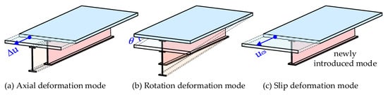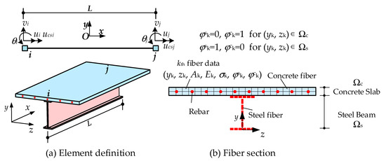 For the fiber numbered k within the cross-section of the element, the specified data includes fiber centroid coordinates (yk, zk), fiber area Ak, fiber region flag and , fiber stress σk and fiber tangent modulus Ek, as shown in Figure 2b. For fibers in the concrete slab ((yk, zk) ∈ Ωc), and ; otherwise ((yk, zk) ∈ Ωs), and . Then, the axial strain of fiber k can be yielded by Equation (7). The slip displacement at the location x can be denoted as Equation (8).