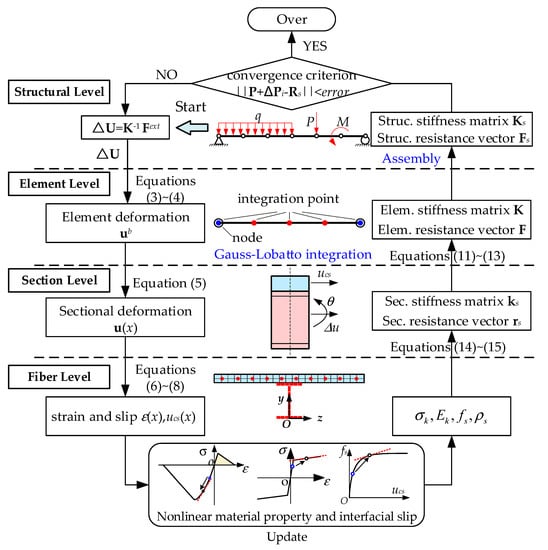 Figure 4 shows the stress and tangent modulus update flow during each iterative calculation process. With applied load, the structural trail deformation is calculated first. Then, the element deformation can be obtained from Equations (3) and (4) and the sectional deformation at the integration point can be calculated using Equation (5). With Equations (6)–(8), the fiber strain ε(x) in the section and the relative deformation ucs(x) can be calculated. Based on the constitutive model of material and interfacial connection, the force and the tangent modulus can be updated. With the summation of fibers in the cross-section at the integration point, the sectional stiffness matrix and resistance vector can be obtained from Equations (14) and (15). From the integration along the beam length, the stiffness matrix and resistance vectors are calculated and then assembled to form the whole structural matrix for the next iteration. In this way, the stiffness matrix and internal force vectors were updated from the fiber to the section and then to the element and structural level in turn. The material, geometric and interfacial nonlinear behaviors of the composite beam were all considered in the proposed element.