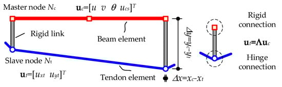 Taking the beam node as the master node and the external tendon node as the slave node, the interaction relationship between the DOFs of the two nodes (DOFs of beam node named uc and DOFs of tendon node named ut) can be expressed as Equation (20). As shown in Figure 6, one end of the rigid link connected to the beam node is the rigid connection and the other end connected to the external tendon is the hinge connection. The translational and rotational displacements of beam nodes lead to the translation of tendon nodes.