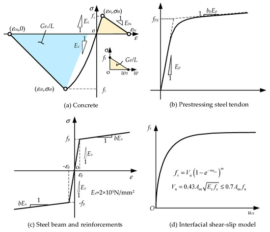 During recent decades, many experimental tests [7,8,9,10,11,12,13,14,15,16] have been conducted to investigate the structural behaviors of EPCBs. The test by Ayyub et al. [7] confirmed the improvement of external prestressing on the structural load carrying capacity and ductility. While they also concluded that the interfacial slip caused larger deflections than their analytical predictions with the no-slip assumption. Chen and Gu [8,9] finished two EPCB tests under positive moment loading and four groups of EPCB tests under hogging moment loading, pointing out that external tendons developed substantial incremental stress at the ultimate state. Lorenc and Kubica [10] tested six EPCBs with different tendon profiles. Chen et al. [11,12], Nie et al. [13] and Sun et al. [14] tested the effects of external prestressing in continuous EPCBs and revealed that both the tendon stress increments and interfacial slip effects affected the structural deformation and load-carrying capacity. Recently, more concerns were paid to EPCB designed with a partial shear connection [17,18] or existing structures with degraded interfacial shear resistance in particular [19]. The tests by Hassanin et al. [15] and El-Sisi et al. [16] showed that an increase in shear connection degree from 0.4 to 1.0 led to a 46% load capacity increment of an EPCB. The simultaneous effects of interfacial slip and the unbonded phenomenon of external tendons lead to more difficulties for flexural response predictions of EPCB. The numerical model was usually taken as the optional solution.