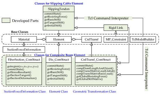 With the derived FE formulations, three types of elements are developed in the OpenSees framework [37] with the C++ programming language. Meanwhile, the Tcl command interpreters are defined in the procedure for the convenient application in the analysis model. The framework of the developed Classes in OpenSees is shown in Figure 8. The advantage of the developed procedure is that there are abundant nonlinear constitutive models and solvers built into the OpenSees software, which can be used conveniently in the numerical model.