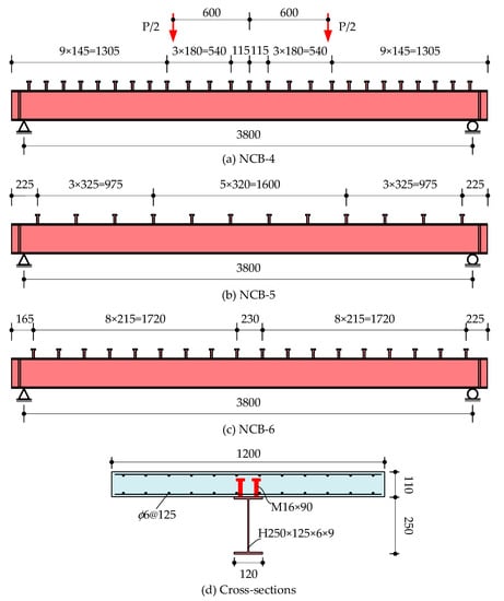 Zhang et al. [17] conducted eight simply supported steel-concrete composite beam experiments to test the influence of interfacial shear connection degree on the flexural behaviors. The compared specimens named NCB-4, NCB-5 and NCB-6 were built with different stud spacings, leading to the failure mode differences. The structural details of NCB-4, NCB-5 and NCB-6 are shown in Figure 9. The material properties are listed in Table 1 and Table 2. According to the design details of shear connectors, the average shear capacity per unit length Vu can be calculated using Equation (23). The values of Vu for NCB-4, NCB-5 and NCB-6 were 860 N/mm, 383 N/mm and 688 N/mm, respectively. Additionally, the shear connection degree η was 1, 0.45 and 0.69 for NCB-4, NCB-5 and NCB-6, respectively.