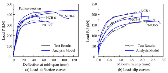 The analysis models of these three tests are built by OpenSees with the newly developed fiber beam element with interfacial slip effects. Meanwhile, the traditional fiber beam element is also employed to model the case without interfacial slip for comparisons. Figure 10a,b show the calculated results of load-deflection and load-slip curves, respectively. Some conclusions can be drawn by observing these comparisons. With an increase in shear connection degree, the stiffness and carrying capacity are both significantly improved. The proposed model and developed procedure can effectively capture the nonlinear interfacial slip behaviors, and the calculated results agree well with the tests.