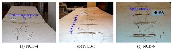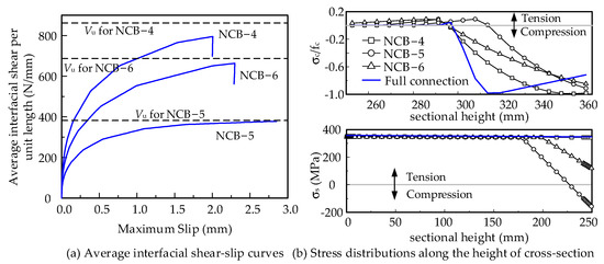 To further validate the prediction of the proposed model for the failure mode caused by nonlinear interfacial slip behaviors, the interfacial shear-slip curves are output from the models, as shown in Figure 11a,b, which shows the stress distributions along with the height of the failure cross-section at ultimate states. The failure modes observed by Zhang et al. [17] are shown in Figure 12. For the specimen with the lowest shear connection degree, NCB-5, the ultimate interfacial average shear almost reached the specified capacity. The ultimate stress of the top fiber in the concrete slab was lower than its compressive strength, meaning that the failure mode was caused by the interfacial slip rather than the concrete crushing. The observed failure modes caused by split cracks in Figure 12b validate this judgment. For NCB-4, the interfacial slip occurred but did not reach the ultimate states and the top concrete fiber reached its peak strength. The failure mode of NCB-4 is shown in Figure 12a. For the full shear connection model without slip effects, the top concrete fiber was in the stage of compression softening. The concrete slab was crushed and the steel beam showed full section yield, as shown in Figure 11b. The comparisons revealed that interfacial slip effects inevitably existed and significantly influenced the flexural behaviors of the steel-concrete composite beam, even when the shear connection degree was set to 1. The proposed model can effectively predict the flexural capacity, deformation and failure modes of composite beams with interfacial slip effects.