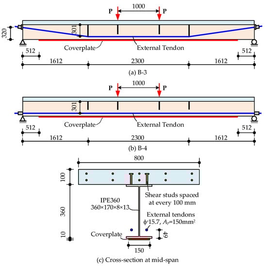 Lorenc and Kubica [10] tested the flexural behaviors of externally prestressed steel-concrete composite beams with different tendon profiles. Two specimens, named B3 and B4, are employed to verify the proposed model. B3 and B4 had similar structural dimensions (as shown in Figure 13) except for the tendon profiles, which were draped-style for B3 and straight-style for B4. The average compression strength of concrete fc = 31.7 MPa and the elastic modulus Ec = 28.6 GPa. The yield strength of the steel beam fy = 293 MPa and the yield stress of the cover-plate was 358 MPa. According to the push-out tests of the shear connector, the maximum interfacial shear capacity of a single connector was 75 kN and the authors recommended α = 0.3, β = 0.55. The reinforcements of 8 mm diameter were embedded into the concrete slab, and the yield stress of the rebar was 428 MPa. The external prestressing was implemented using two nominal diameters of 15.7 mm seven-wire strands, whose Ap = 150 mm2, Ep = 197.8 GPa and initial effective prestress σpe = 950 MPa.