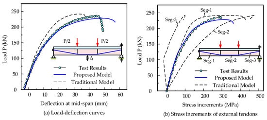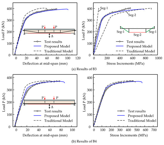 Figure 14a shows the analysis results of specimen B3. The proposed model shows good agreement with the tests for both load-deflection curves and tendon stress increments. However, for the traditional model, the initial structural stiffness is overestimated due to the ignored interfacial slip and the structural capacity is also slightly overestimated. Meanwhile, the stress increments of the external tendon in the traditional model are different in the side and middle branches due to the strain-incompatible condition in the separated truss element. The stress increment of the side branch truss element (seg-1) is small and that of the middle truss element (seg-2) is large, as shown in Figure 14b. Specimen B4 is prestressed with straight tendons, in which case, the proposed slipping tendon element used is the same as the traditional truss element. The main differences between the two models are the interfacial slip effects. The traditional model overestimates the initial structural stiffness and the proposed model shows a better prediction. Compared with the traditional model, the proposed element significantly improves the prediction accuracy.
