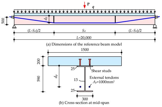 The verified finite element model is employed to conduct a parameter analysis of factors that affect the flexural behaviors of EPCBs. The main discussed factors included the deviator spacing, the effective height of external tendons and the interfacial shear capacity. The structural details of the reference model are shown in Figure 17. The material properties were as follows: for the concrete slab, the compressive strength fc = 30 MPa and the elastic modulus Ec = 30 GPa; for the steel beam, the yield strength fy = 300 MPa and the elastic modulus Es = 200 GPa; for the external tendons, the yield strength fpy = 1860 MPa, the elastic modulus Ep = 195 GPa, and the initial effective prestress σpe = 1000 MPa.