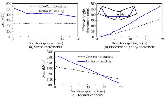 Based on the reference model, the deviator spacing Sd is set to range from 0.4 m to 19.6 m at intervals of 0.4 m. A total of 49 analysis models are built to discuss the effects of deviator spacing on the structural behaviors. The calculated results of tendon stress increments, effective height decrements dp and flexural capacity are presented in Figure 18. With an increase of deviator spacing, the stress increments are slightly decreased but the decrements of dp are increased. The results reveal that the second-order effects are significant for cases with large deviator spacing. Along with the variation in Sd from 0.4 m to 19.6 m, the flexural capacity decreases by 6.7% under one-point loading states and 10.8% under uniform loading states. The increasing Sd causes a decrease in flexural capacity.