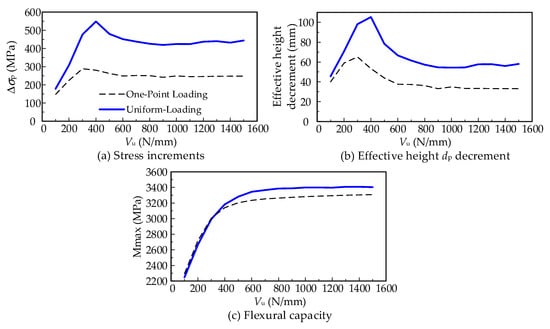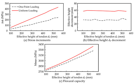 The external tendon effective height dp ranges from 110 mm to 550 mm at intervals of 40 mm. A total of 12 analysis models are built to discuss the effects of dp on the structural behaviors. The results are shown in Figure 19. Interestingly, we find that the effects of dp on its decrements are small, which is different from the effects of Sd. With an increase in dp, the stress increments and flexural capacity are increased. The stress increments and decrements of dp under uniform loading are all larger than the ones under one-point loading states. Along with the variation of dp from 110 mm to 550 mm, the flexural capacity increases by 20.0% under one-point loading states and 23.0% under uniform loading states. The increasing dp increases the flexural capacity.