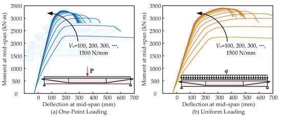 In the reference beam, the deviator spacing Sd = 6 m, the effective height of external tendon dp = 550 mm, and the average interfacial shear capacity at the unit length was set Vu = 900 N/mm (shear connector degree η = 1). During the parameter analysis, the parameters’ values were all the same as those of the reference beam except the discussed parameter. For each parameter analysis, two loading types including one-point loading at mid-span and uniform loading were applied and analyzed.