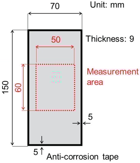 The length, width, and thickness of each plate are 150 mm, 70 mm, and 9 mm. Each plate is wrapped with a 5 mm anti-corrosion tape along all its edges to keep the non-corrosion part at the edges as the reference for the corrosion depth measurement. The back surface of the specimen was covered by the anti-corrosion tape for generating the corrosion from the top surface only. Figure 1 explains the size of each steel plate and the corrosion measurement area in the experiments. We monitor and measure the corrosion depth in a 50 mm × 60 mm area in the middle of the steel plate.