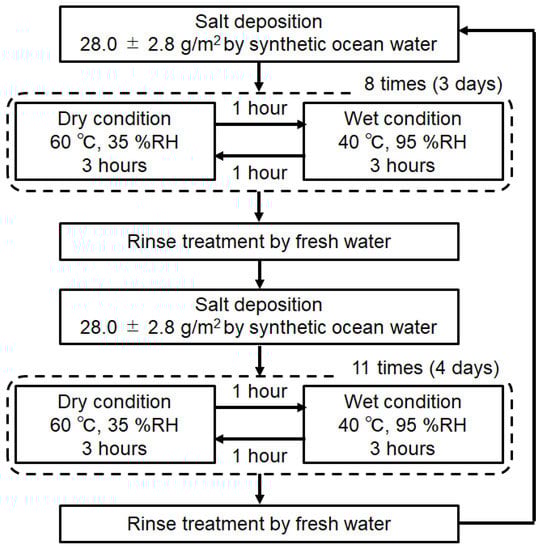 ISO16539: An accelerated cyclic Test with synthetic ocean water salt-deposition process. ISO16539 [29] is a standard defined by International Organization for Standardization. It defines two accelerated cyclic corrosion Test procedures: Methods A and B, for the evaluation of corrosion behavior of surface-treated metals and their alloys with and without paint on them in atmospheric environments with exposure to synthetic ocean water salt-deposition process and dry/wet conditions at constant absolute humidity. For coated steel structures used in power supply, researchers have verified the correlation between the experimental circumstance and the actual circumstance [30]. Some recent research [31] tries to apply this Test procedure to other industries, such as the auto industry and infrastructure. In this research, we use Method B. Figure 2 illustrates the procedure of our experiment. Artificial seawater with a concentration of 3.5% was applied to the surface using a spraying device, and a salt deposition of 28.0 ± 2.8 g/m2 was obtained. The repeated drying and wetting process consisted of three hours of dryness (60 °C, 35%RH) and three hours of wetness (40 °C, 95%RH), and the transition time from dry to wet and from wet to dry was one hour, which was 8 h per cycle. This was done alternately in 8 cycles (3 days) and 11 cycles (4 days).