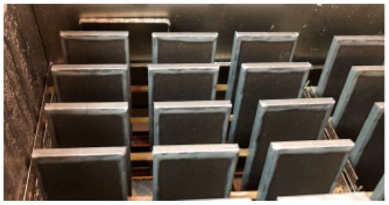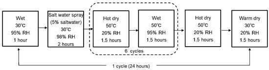 PWRI: A combined cyclic corrosion Test. This is an accelerated corrosion Test developed by Public Works Research Institute, which is a developed corrosion procedure widely used in Japan. There are two groups of corrosion experiments and each group has two samples of each type of steel plate. In total there are 16 ( 4 × 2 × 2 ) samples. The first group runs for 28 days of the experiment and the second group runs for 84 days of the experiment. Figure 3 shows the organization of 16 steel plates. Figure 4 shows the procedure of the experiment. One complete cycle takes 24 h. It consists of one hour of wetness (30 °C, 95%RH), two hours of surface spraying with saltwater (30 °C, 5%NaClaq), six repetitions of one and half hours wetness (50 °C, 95%RH), one and half hours of dryness (50 °C, 20%RH), and another one and half hours of dryness (30 °C, 20%RH).