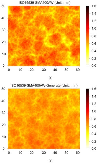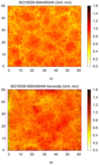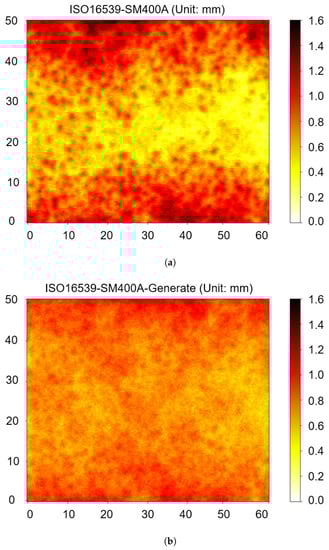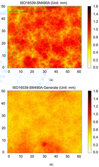 Figure 8, Figure 9, Figure 10 and Figure 11 illustrate the comparison of the corrosion on steel plates in stage three from the ISO16539 experiment and corresponding simulated corrosion generated by our system. Figure 8, Figure 9, Figure 10 and Figure 11 are corresponding to four types of steel plates involved in this research. Taking Figure 8 as an example, it shows the corrosion of steel plate type SM400A in stage three. Figure 8a shows the real steel plate and Figure 8b is the simulated steel plate. The colors demonstrate the status of the corrosion. The yellow color means it is slightly corrosive. The red (and dark) color means the corrosion is worse. Figure 8a,b demonstrate a similar pattern of the distribution of corrosion, which means our system can accurately simulate the corrosion on the measured area. Similarly, Figure 9, Figure 10 and Figure 11 demonstrate the excellent performance of our system in simulating or predicting the corrosion on the other three types of steel plates.