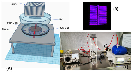 The discharge system includes an SDBD reactor, gas feeding unit, discharge energization system, electrical and optical diagnostics, and sample holder suitable for inserting biological samples at a selected distance from the discharge surface. The SDBD reactor shown in panel (A) of Figure 1, consists of a planar SDBD electrode system placed in a PVC chamber equipped with gas feed input/output ports and a high voltage (HV) interface.