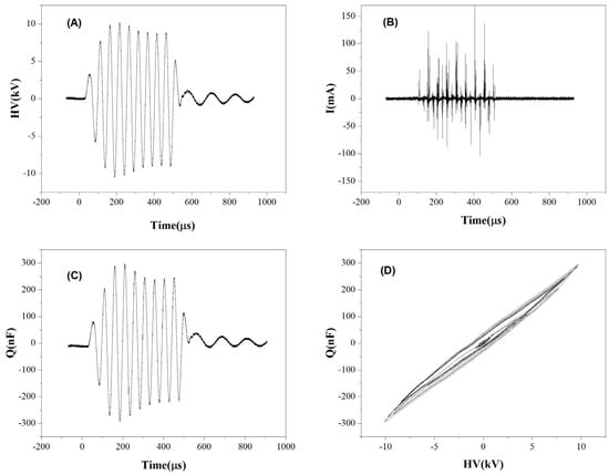 Typical waveform for 1 burst applied to the discharge reactor: (A) voltage; (B) current; (C) charge; (D) Lissajous figure for estimating the burst energy deposited in the plasma phase.