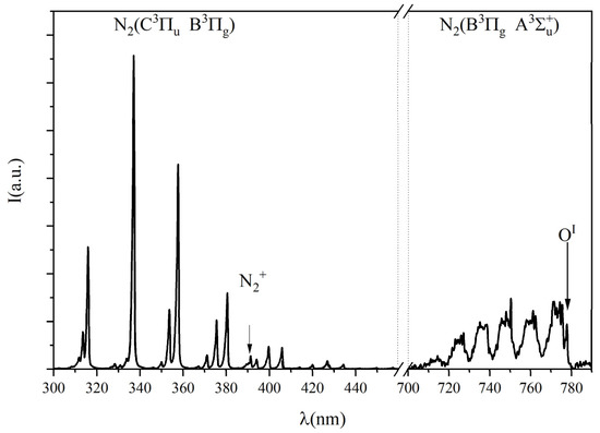 Figure 3 shows low-resolution emission spectra of filamentary SDBD operating in humid air and reveals strong bands of the second positive system (SPS) (C3Πu → B3Πg) of N2 and the first negative system (FNS) (B2Σu+ → X2Σg+) of N2+ in the UV spectral region. In the Vis-NIR region, we observed characteristic sequences of bands of the first positive system (FPS) (B3Πg → A3Σu+) of N2. The emission line for atomic oxygen was observed at 777 nm, indicating the production of atomic oxygen during the plasma phase.