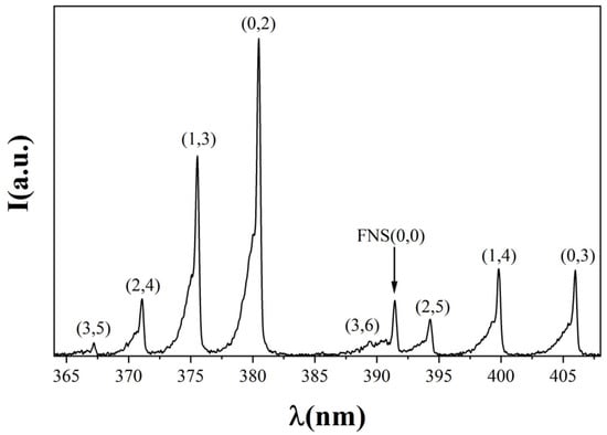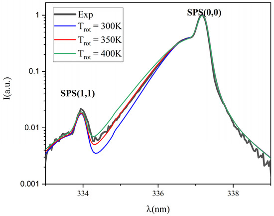 The gas temperature, in such conditions, is equal to the rotational temperature of the emitting molecules. The partially resolved structures of SPS (0,0) shown in Figure 4 were analysed using the Massive OES spectroscopy tool [74,75,76]. The SPS (0,0) band can be fitted for a specific instrumental function by setting the rotational temperature to 350 ± 25 K.
