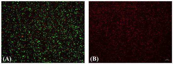 Fluorescent probes were used to assess cell membrane integrity and XfDD viability after incubation in PAW. The untreated control cells were almost all stained green with SYTO 9, indicating that they were viable. A small number of cells were stained red with propidium iodide (PI), indicating that they were probably dead (Figure 8A). The number of cells stained red with PI increased dramatically after treatment with PAW, while cells stained with SYTO 9 decreased as expected, and only a few fluorescent cells were visible after treatment (Figure 8B). This indicates that the integrity of the cell membrane of the bacteria was damaged by the treatment, affecting their viability.