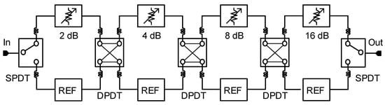 The proposed 4-bit digital step attenuator topology is shown in Figure 2. The attenuator consists of SPDT switches at the input and the output ports, three double-pole double-throw (DPDT) interstage switches, and T-type resistive attenuation networks. The digital step attenuator is implemented with only passive devices. Therefore, the digital step attenuator can operate in both the transmitter and the receiver with nearly zero DC power consumption.