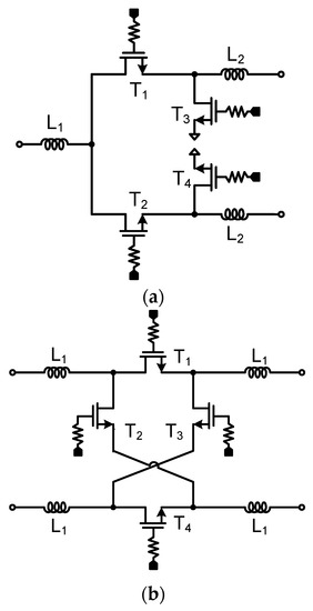 As shown in Figure 4a, the series transistors (T1, T2) are used in the SPDT switch for switching the attenuation states, and the shunt transistors (T3, T4) are used to improve switch isolation. Only four cross-connected series transistors (T1–T4) are used in the DPDT switch in Figure 4b. The shunt transistors for the isolation are not included in the DPDT switch in order to reduce parasitic shunt capacitances, since small-size switch transistors are not available in commercial GaN HEMT technology and a moderate isolation characteristic can be achieved with only series switches at less than 12 GHz. The series inductors of L1 and L2 are implemented to enhance the input- and output-matching performance. A simulated insertion loss of less than 1.3 dB is achieved and the isolation is greater than 15 dB at 12 GHz. Since only two interconnecting metal layers are available in the GaN HEMT process, the top, thick metal layer is used in the inductors and the microstrip transmission lines for a high Q-factor, and the bottom, thin metal layer is used for the digital control lines. A 2.5D electromagnetic simulation was performed carefully to design the matching inductors and interconnection microstrip transmission lines.
