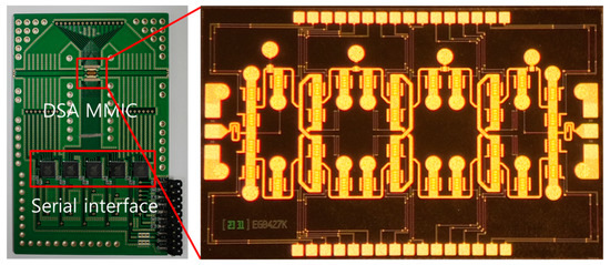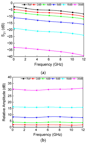 The 4-bit wideband digital step attenuator MMIC was fabricated with 0.25 μm GaN HEMT technology on a GaN-on-SiC substrate. A microphotograph of the 4-bit GaN digital step attenuator MMIC is shown in Figure 5. The chip size is 2.45 × 1.75 mm2 including DC and RF pads. The DC and the digital control pads of the GaN digital step attenuator MMIC are bonded on the PCB, which includes the serial-to-parallel interface with a negative gate control voltage generator for the digital control voltages of −3.3 V(off-state) and 0 V(on-state). On-wafer measurement was performed to characterize the GaN digital step attenuator MMIC using a vector network analyzer and short-open-load-through (SOLT) calibration.