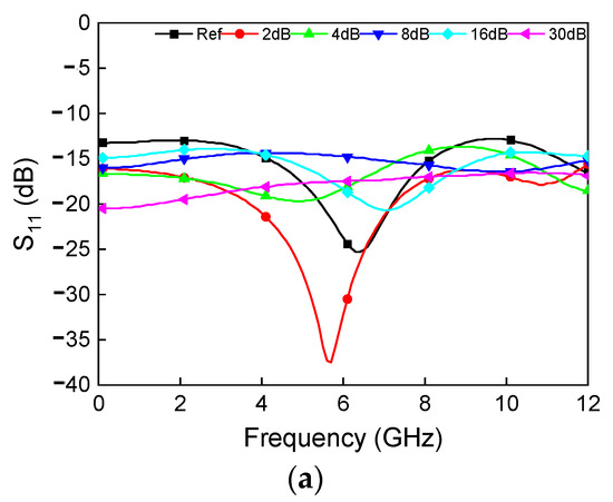 Figure 6 shows the measured insertion loss and normalized attenuation performance of the GaN digital step attenuator MMIC. The insertion loss of 2.8−8.3 dB is achieved in the reference state at DC-12 GHz. The attenuation range of 30 dB and the attenuation step of 2 dB are achieved with flat attenuation performance versus the frequencies. As shown in Figure 7, the input and output return losses of >12 dB are achieved from DC to 12 GHz. Figure 8 shows the measured RMS amplitude and phase errors. The measured RMS amplitude error is less than 1 dB and the RMS phase error is less than 8.5° at DC-12 GHz. The total DC power consumption is nearly 0 mW. A performance comparison of the previously published III-V digital step attenuator MMICs is summarized in Table 2.