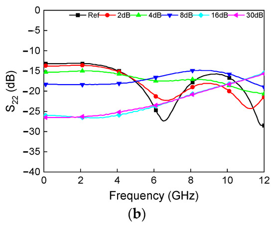 Measured (a) S11, and (b) S22 of the GaN digital step attenuator MMIC.