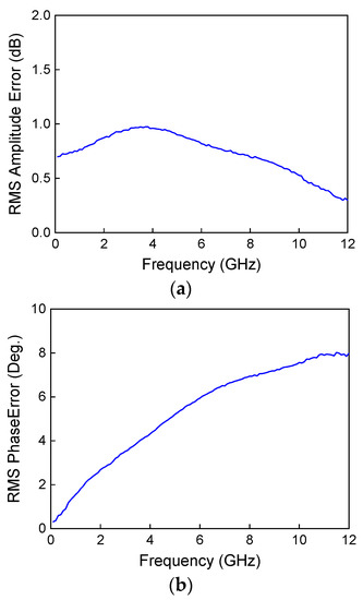 Measured (a) RMS amplitude error, and (b) RMS phase error of the GaN digital step attenuator MMIC.