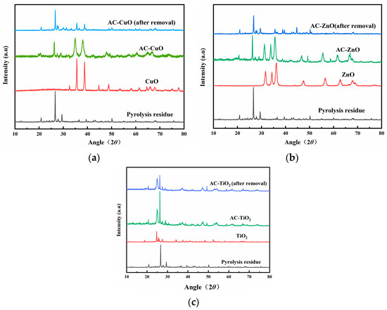 X-ray diffraction of the pyrolysis residue and AC-CuO, AC-ZnO, and AC-TiO2 are shown in Figure 6. It can be seen that the characteristic diffraction peaks of CuO appeared near 35°, 38°, 49°, and 66° in AC-CuO, and the peaks at 61° and 68° were stronger than those of the pyrolysis residue. After removal of methylene blue, the characteristic diffraction peaks remained relatively stable. The characteristic diffraction peaks of ZnO (characteristic diffraction peaks near 32°, 34°, 36°) and TiO2 (characteristic diffraction peaks near 25°, 37°, 48°) appeared on AC-ZnO and AC-TiO2, respectively, indicating that AC-ZnO and AC-TiO2 were successfully prepared.