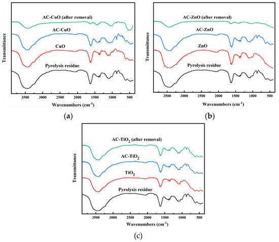The FT-IR analysis of pyrolysis residue and AC-CuO, AC-ZnO, and AC-TiO2 are shown in Figure 7. It can be seen that the -OH absorption peak and C = C stretching vibration absorption peak of the pyrolysis residue presented at 3421 and 1638 cm−1, respectively, indicating that there were hydroxyl and C = C functional groups on the surface of the residue. There were two absorption peaks at 872 and 613 cm−1, indicating the existence of meta-disubstituted aromatic hydrocarbons on the surface of the pyrolysis residue. The absorption peak near 471 cm−1 may have been caused by the mineral composition in the sludge ash [35]. Compared with that in the pyrolysis residue, the -OH absorption peak of the composite materials weakened due to the supported metal oxide. Among them, the characteristic peaks of CuO, ZnO, and TiO2 presented were between 410 and 610 cm−1 [36], 400 and 600 cm−1 [37], and 400 and 1000 cm−1 [38], respectively, indicating that AC-CuO, AC-ZnO, and AC-TiO2 were successfully prepared.