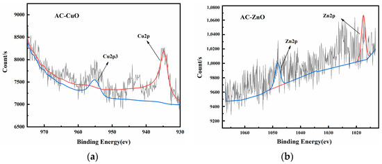 Figure 8 shows the XPS images of AC-CuO, AC-ZnO, and AC-TiO2, respectively. High-resolution XPS spectra of Cu 2p, Zn 2p, and Ti 2p demonstrated the presence of prominent Cu, Zn, and Ti peaks in the composite materials, respectively, indicating that CuO, ZnO, and TiO2 had been attached to the pyrolysis residue.