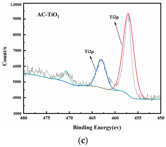 From the EDS diagram in Figure 3, it can be seen that there were no energy spectrum peaks of Cu and Zn elements in the pyrolysis residue, but there were energy spectrum peaks of trace Ti elements. However, compared with those of AC-CuO, AC-ZnO, and AC-TiO2, it was found that energy spectrum peaks of Cu, Zn, and Ti appeared on the energy spectrum, respectively [30], indicating that CuO, ZnO, and TiO2 were successfully loaded on the pyrolysis residue.