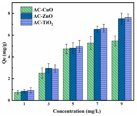 Figure 9 shows the effect of different dosages on the removal of methylene blue. It can be seen that the removal effect of methylene blue gradually increased with the increase in the dosage of AC-CuO, AC-ZnO, and AC-TiO2 from 0.5 to 5.5 g/L. This may be due to the fact that more loading provided more surface area and pore structure, thus increasing the available active sites [39].