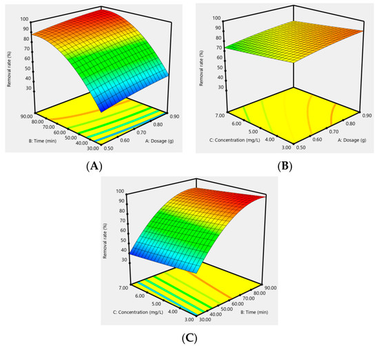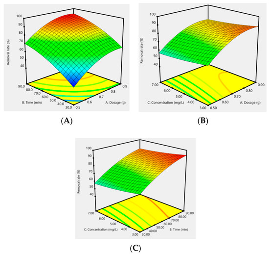 Based on the dosage, contact time, and concentration parameters in the removal process for AC-CuO, AC-ZnO, and AC-TiO2, the Box–Behnken design tool of Design Expert 7.0 software was used to conduct matrix design, and then, the effect of the interaction between various factors on the removal performance of methylene blue was studied. The experimental range and level of independent variables are shown in Table 1. Taking A—dosage (g); B—time (min); and C—concentration (mg/L) as independent variables, the significance analysis results of the response surface regression models of AC-CuO, AC-ZnO, and AC-TiO2 were studied.