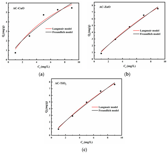 Figure 16 is the isotherm model of AC-CuO, AC-ZnO, and AC-TiO2, and the correlation coefficients are shown in Table 6. We found that both the Langmuir adsorption isotherm model and Freundlich adsorption isotherm could describe the removal process of methylene blue (R2 > 0.9). Therefore, it can be considered that the adsorption sites of AC-CuO, AC-ZnO, and AC-TiO2 for methylene blue were uniformly distributed and had the same affinity, and the adsorption process was mainly represented by chemical adsorption [46].