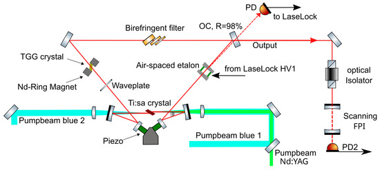 - Hamilton, C.E. Single-frequency, injection-seeded Ti:sapphire ring laser with high temporal precision. Opt. Lett. 1992, 17, 728–730. [Google Scholar] [CrossRef]
