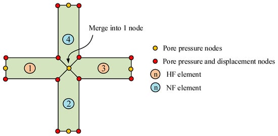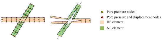 Generally, cohesive elements are considered as being composed of two faces separated by a thickness, as depicted in Figure 3a. The relative motion of the bottom and top faces measured along the thickness direction represents the opening and closing of fractures. The relative change in position of the bottom and top faces measured in the plane orthogonal to the thickness direction quantifies the transverse shear behavior of the cohesive element. The bottom surface and the top surface of the element will internally form intermediate pore pressure nodes, which can be observed in Figure 3a (node 5 and node 6). When the mid-surface is separated, driven by the fluid pressure, the fracturing fluid fills the fracture space; then, as shown in Figure 3b, normal flow occurs towards the top and bottom surface while tangential flow takes place at the intermediate node. In the CZM, the fractures are restricted to propagate along the cohesive element layer without being deflected into the rock matrix, as shown in Figure 4, which requires how the fracture will propagate be known. However, it is quite difficult to prefabricate all the fracture propagation paths in a naturally fractured formation, as fully developed natural fractures will greatly increase the morphology complexity of hydraulic fractures. In this work, we realize the fracture to extend along any element boundary after it initiates by using global cohesive elements. The cohesive element COH2D4P with pore pressure DOF was inserted arbitrarily into two adjacent rock elements and a natural fracture element. The cohesive elements were zero geometric thickness, which guaranteed the mechanical properties of the rock would not be affected. Since the fluid pressure is transmitted through intermediate pore pressure nodes, pore pressure nodes are shared between any two adjacent elements by converging all the intermediate nodes together, as schematically shown in Figure 5.