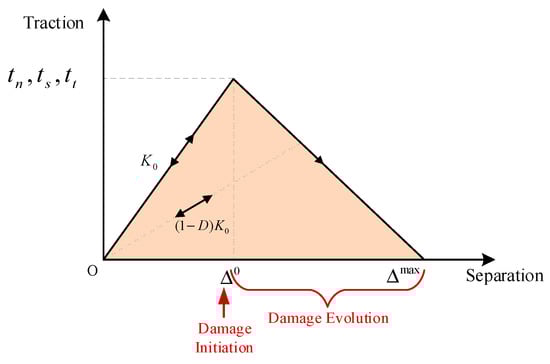 With the injection of fracturing fluid, the traction increases as the fracture surface separates from each other. With the increase in separation degree, due to the degradation (or softening behavior) of the stiffness of the material, the traction decreases [47] until the fracture tip is completely destroyed, and the tractive strength of the fracture surface drops to zero. The damage evolution law can be characterized by a bilinear cohesion traction-separation relationship [48], shown in Figure 2, which can be expressed as follows: