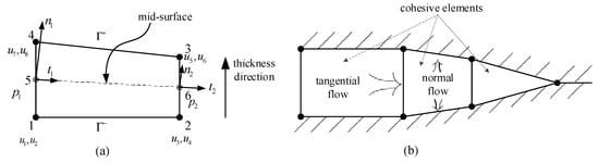 Figure 3. (a). Schematic of two-dimensional pore pressure cohesive element. (b) Fluid flow in cohesive element. The pore pressure cohesive element can simulate a tangential flow and leak-off from fracture to rock matrix.