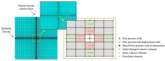 Figure 1. Schematic of the intersection between a hydraulic fracture and a natural fracture using pore pressure cohesive elements. Inspired by [32].