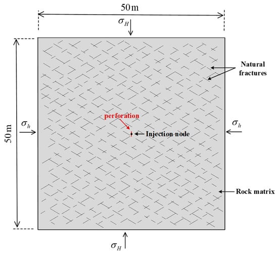 The model size was 50 m × 50 m, with uniformly distributed in situ stress loaded on the boundary, as depicted in Figure 6. The maximum in situ horizontal stress σ H was in the vertical direction, and the minimum in situ horizontal stress σ h was in the horizontal direction. A 1-m-long perforation was prefabricated at the center of the model with an injection node at the midpoint. Fracturing fluid entered the model from the injection node and flowed through the perforation. About five hundred natural fractures were randomly distributed in two symmetrical directions with certain restrictions as follows: (1) the fracture length was in a specified range (1 m, 3 m); (2) the fracture length spacing range was (1 m, 2 m); (3) the fracture width spacing range was (2 m, 3 m); and (4) the x coordinate of the starting point was half length of the model diagonal to ensure that the natural fracture network center was at the center of the model. The natural fracture network model was programmed in Python, and the Newton-Raphson algorithm was used to analyze the diffusion and stress of the coupling pore fluid in the model. Modelling the initiation and propagation of hydraulic fracture intersecting with natural fractures network is a strongly nonlinear problem, involving the multi-field coupling effect of stress field and seepage; so, a powerful solver is needed. The calculation process was implemented in the finite element commercial software ABAQUS. Figure 7 shows the principle of the global cohesive element model. Two steps were included in the coupled pore fluid diffusion and stress analysis: (1) a geostatic step, which established equilibrium between the initial pore pressure and in situ stresses and removed the initial deformation; (2) a soil step, which simulated the hydraulic fracture initiation and propagation under the coupling of the rock skeleton and pore fluid. Natural fractures were assumed to be closed as the weak planes and assigned relatively smaller rock mechanical parameters, until driven by the fluid pressure under the Traction-Separation Law.