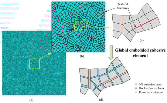 Figure 7. Schematic diagram of the natural fractures network model established using global cohesive elements. (a) Mesh generation of the natural fractures network model. (b) The mesh is locally enlarged to show the location of the natural fracture more clearly. (c) Mesh before embedding cohesive element. (d) Mesh after global embedding cohesive elements.